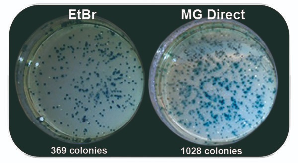 The isolation of DNA from agarose gels enables downstream applications. It is well known that many dyes, such as ethidium bromide or even SYBR™ Green are strong enzyme inhibitors due to their intercalating properties. MIDORI Green dyes bind to the DNA backbone. This results in a much higher efficiency for downstream applications, i.e. cloning (Fig. 2), seqeuncing, PCR, etc.