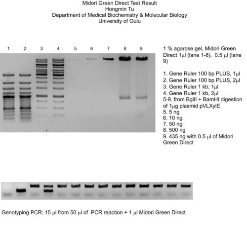 - Mix samples and DNA markers with MIDORI GREEN DIRECTstain at 1:10 (dye:sample) dilution rate