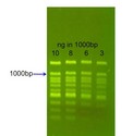 The direct staining of the DNA rather than the gel eliminates the background staining providing a perfect signal (Fig. 1). MIDORIGreen Direct was developed to work with Blue Light LED illuminators, but you can also use it with a regular UV transilluminator.