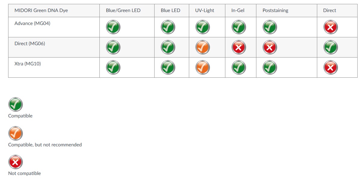 - MIDORI Green Advance (for UV-light or Blue/Green LEDs, in-gel or post staining)