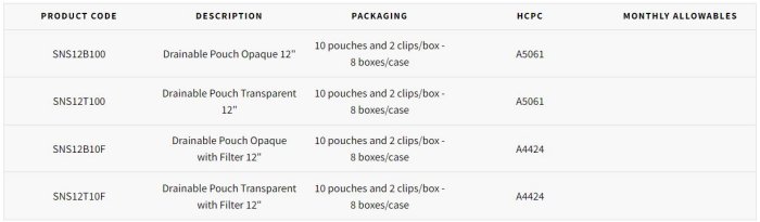 Cut to Fit Drainable Pouches. 2 Clips per Box. Comes in Opaque or Transparent Colors. Comfortable Fit Panel. Dual Adhesive Tapes. Option for Filter.