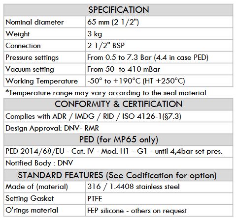 2½” MEGA SUPERVENTIX™ threaded safety relief valve is designed to protect tanks against accidental overpressure and excessive vacuum. With a smart compact design, the 2½” BSP MEGA SUPERVENTIX™ SRV has a high flow performance.