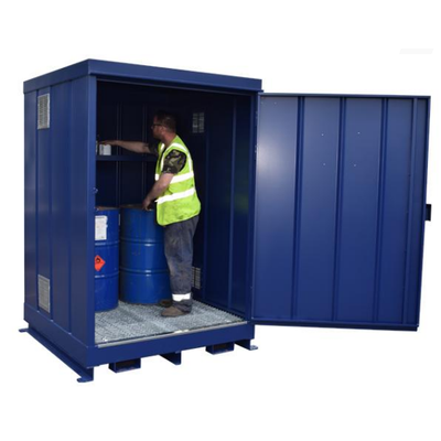 4 Drum / 1 Pallet Store. Walk in store with single hinged door. Dimensions: 1500w x 1500d x 2250h mm. Storage: 4 x 200 litre Drums. 300 mm deep shelf for smaller containers. Clear space above drums allows usage of Drum Pumps. Bund: 300 litres (exceeds PPG26 & EPA 110% and 25% guidelines). Bund Tested and Certified before dispatch. Construction: High strength welded steel construction. Steel zinc coated/galvanised. No sharp edges/protrusions. Suitable for internal or external use. Finish: Polyester powder coated paint finish – standard colour Blue RAL 5013. Access: Hinged door (stainless steel hinges) with spring latch. Optional high security pad lock box. Ventilation: 4 no. 200mm vents. Signage: Safety/warning signage fitted as standard. Wall mounted MSDS Holder. U.L.W: 750kgs.