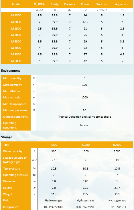 The hydrogen generators "M" series are specially designed for use in industry and renewable energy. Automatic production of hydrogen is used for various industrial applications or as an energy source for electricity generation. Simple and reliable, they can operate whatever the climatic and environmental conditions. They are able to supports high fluctuations as well as sudden interruptions of the power supply. In case of prolonged mains failure, the generator will stay in stand-by and then will restart automatically without any assistance.