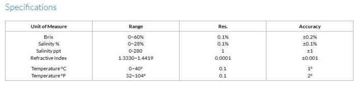 Measure concentrations in brix, salinity, refractive index and clinical parameters with full scale accuracy of 0.1% using CCD scanner (= linear scanned array imaging) technology . Simple to use. All models calibrate to distilled water and require a sample of only 0.4 ml. Instantly displays temperature in addition to multiple scales with the unit of measure indicated on the large LCD. The sophisticated microprocessor provides automatic calibration, automatic temperature compensation, automatic shutoff (after 3 minutes), and visual min/max alarms. Low power consumption enables 5000 readings, before the LCD indicates that the battery should be replaced. The water resistant design protects the electronics from wet environments and makes for easy clean ups. Comes ready to use with a 9V battery, distilled water, a transfer-pipet, instructions and a protective case.