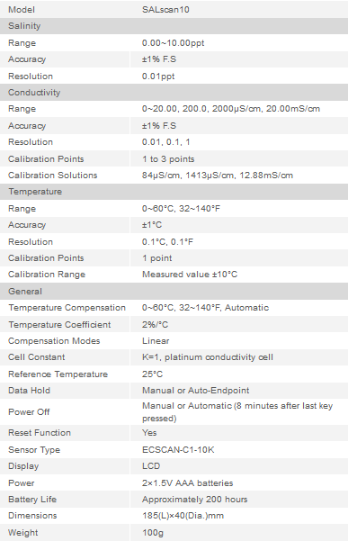 Low-range pocket salinity tester, 1 to 3 points calibration, setup menu contains the 5 optional parameters. The meter is suitable for general applications. Accuracy: 1% F.S.