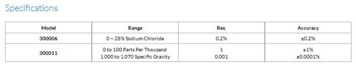 300011 - Salt Refractometer w/ATC 0-100ppt Features Automatic Temperature Compensation (ATC), which makes manual temperature corrections unnecessary. Double scale in parts per thousand and specific gravity. Measures salt content in sea water, breeding ponds, or pickling-brines and other applications. While the scale is calibrated for sodium chloride, it can also be used for calcium chloride, barium cobalt, magnesium, cesium, potassium, sodium chloride, cupric sulfate, potassium iodide, citric acid, acetic acid and (vinegar), when tested against a known standard.