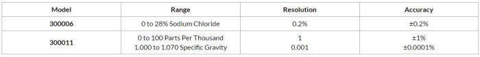 300011 - Salt Refractometer w/ATC 0-100ppt Features Automatic Temperature Compensation (ATC), which makes manual temperature corrections unnecessary. Double scale in parts per thousand and specific gravity. Measures salt content in sea water, breeding ponds, or pickling-brines and other applications. While the scale is calibrated for sodium chloride, it can also be used for calcium chloride, barium cobalt, magnesium, cesium, potassium, sodium chloride, cupric sulfate, potassium iodide, citric acid, acetic acid and (vinegar), when tested against a known standard.