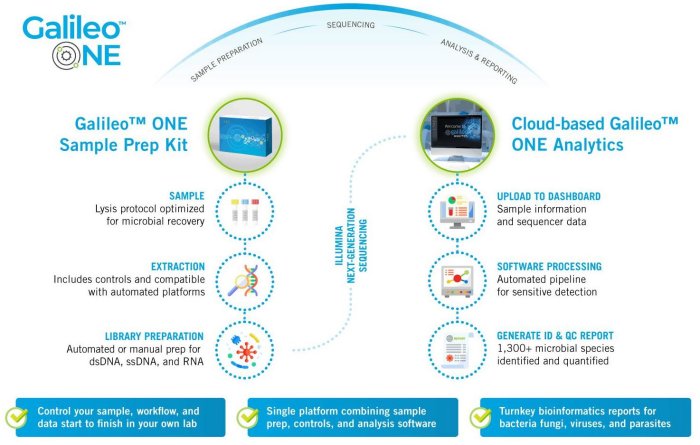 Galileo ONE is a metagenomic NGS (mNGS) platform that takes the user from a primary sample to quantitative results for over 1300 microbes. This turnkey workflow combines the Galileo ONE Sample Preparation Kit with automated analysis and reporting using our cloud-based Galileo Analytics and assumes the user has access to an Illumina sequencer.