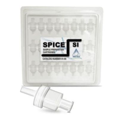 Analtech SPICE Cartridges are prepacked with adsorbent and ready for use. Molded of medical grade polypropylene, each cartridge contains 1 cc of packing. A porous frit and outlet filter combination contain the packing and will remove sample particulate down to 10 microns.In normal use SPICE sample preparation cartridges are compatible with organic solvents and aqueous solutions. Precision Luer fittings provide leak proof liquid connections.