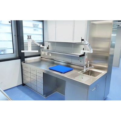 The cover and the substructure of this sample receiving table are made of Cr-Ni 1.4571, as very aggressive chemicals are used in this workstation. This workplace consists of the sampling table and the fresh air supply on the ceiling. The interaction between the fresh air supply element and the sampling table creates a laminar air flow for optimal working conditions. The air extraction in the grossing tables is carried out by a surface extraction in the work surface, an edge suction in the area of the old formalin spout as well as a rear wall suction over the entire length of the table. The basin under the work surface is provided with a sprinkler pipe, the drainage channel of the basin is made with hygienic radii on the floor to ensure easy cleaning.