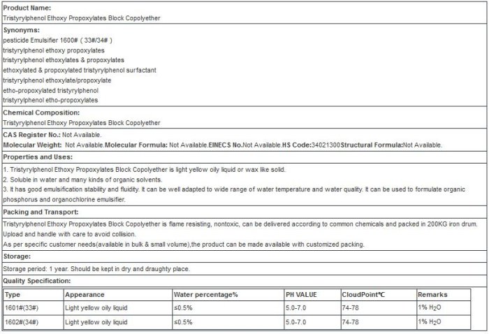 It has good emulsification stability and fluidity. It can be well adapted to wide range of water temperature and water quality. It can be used to formulate organic phosphorus and organochlorine emulsifier.