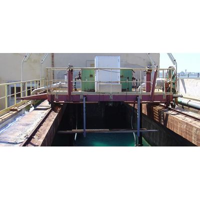 The BEAUDREY sand-collecting gantry is installed across the settling tank channel. It runs on Rails secured at deck level to the channel’s side walls. It travels forwards and backwards along the sand-settling channel. Travel is either continuous or periodical depending on the plant’s specific needs. A pump is installed on the pipe carried by the gantry, it travels along the bottom and removes the sand which travels up to the gantry level and is discharged in a deck flume for disposal. The pump can be either an electrical submerged sand pump or an air-lift bubble device depending on the relative levels of the pit bottom, the low waters and the deck.