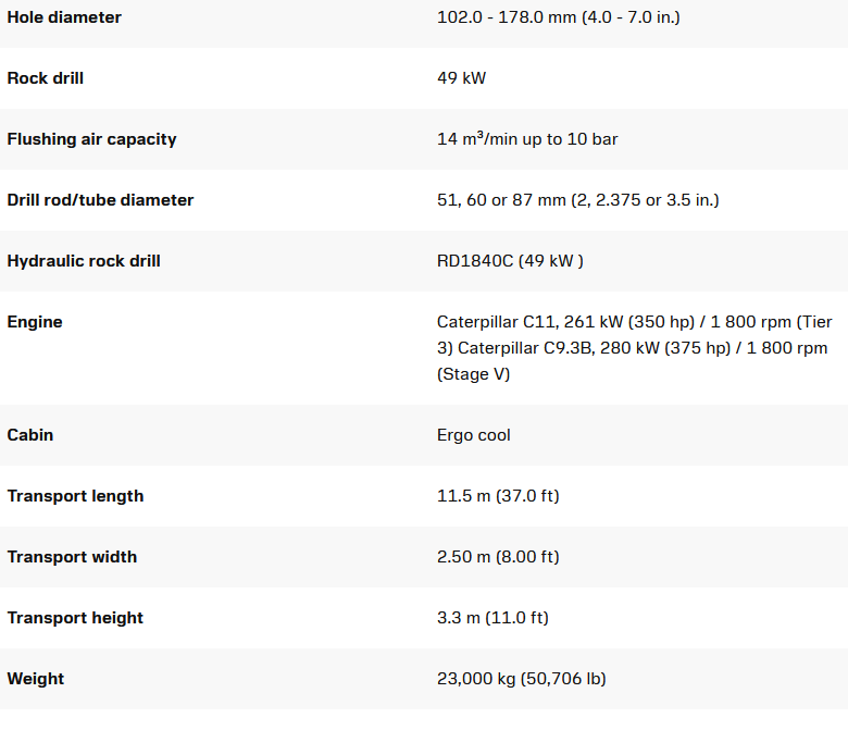 Engineered for large hole drilling, Pantera™ DP1600i excels in drilling holes ranging from 102 to 178 mm (4 to 7 inches) in size. Together with RD1840C rock drill and robust LT90 rock tools, it has a high capacity for large hole drilling without increasing the rig’s physical footprint.