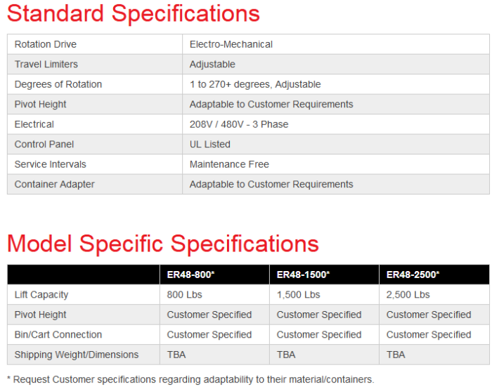 Bin & Cart Adaptors, Stand-alone Controls, Adjustable Travel Limiters to adjust Rotation, Safety Yellow Machinery Enamel Finish,  Key-Lock, Push Button Forward/Reverse
