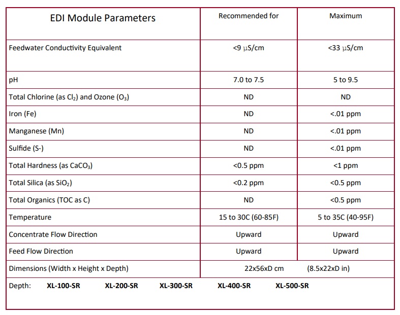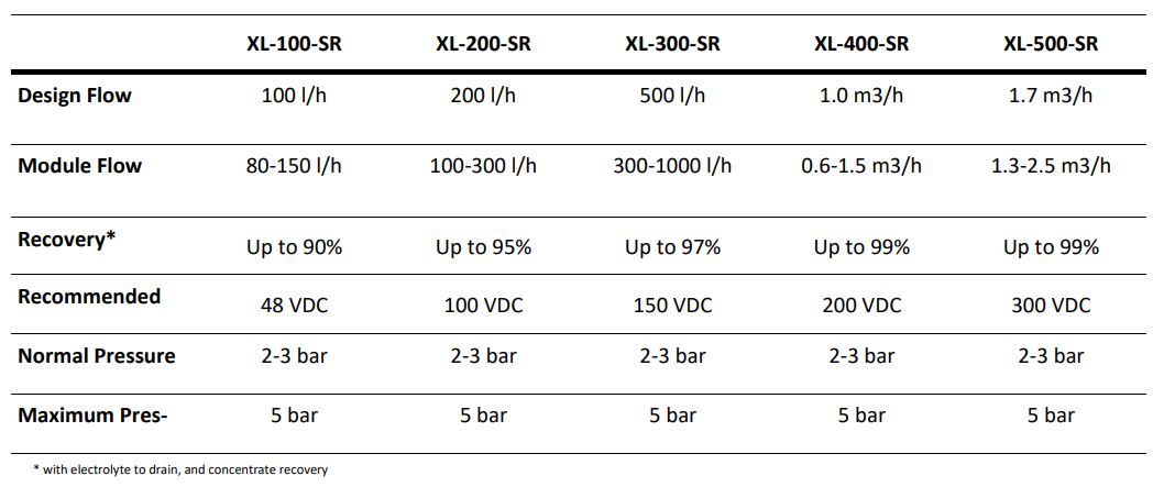 XL-SR Electropure EDI products can handle a range of flows from 50 l/h to 2.3 m3/hr (10 gpm), depending on the specific requirements of the customer. These are designed for periodic cold sanitization using peroxide/peracetic acid (for example Minncare Cold Sterilant).