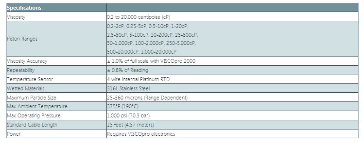 Measurements can be made in 13 different 20:1 viscosity ranges within an overall span of 0.2 to 20,000 cP or the equivalent cSt. Maximum flow rate over the sensor head is 10ft/sec (3 m/sec).