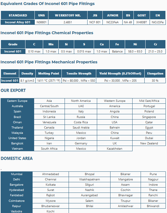 Inconel 601 Pipe Fittings Manufacturers, Inconel 601 Pipe Fittings Suppliers, Inconel 601 Pipe Fittings Stockists, Inconel 601 Pipe Fittings Exporters,Inconel 601 Pipe Fittings Manufacturers in India, Inconel 601 Pipe Fittings Suppliers in India, Inconel 601 Pipe Fittings Stockists in India, Inconel 601 Pipe Fittings Exporters in India, Inconel 601 Pipe Fittings Manufacturers in Mumbai, Inconel 601 Pipe Fittings Suppliers in Mumbai, Inconel 601 Pipe Fittings Stockists in Mumbai, Inconel 601 Pipe Fittings Exporters in Mumbai