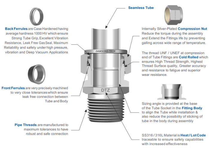 Features of DAWSONS-TECH Twin Ferrule Tube Fittings.