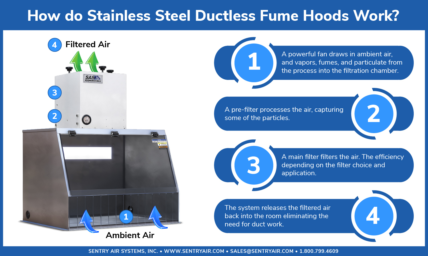 Typically, the applications for a stainless steel ductless fume hood are biological sciences, dust removal, soldering, pharmaceutical compounding containment, chemical fume control, solvent or epoxy use, and many other applications that require the removal of harmful fumes and particulate in a confined area.