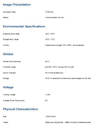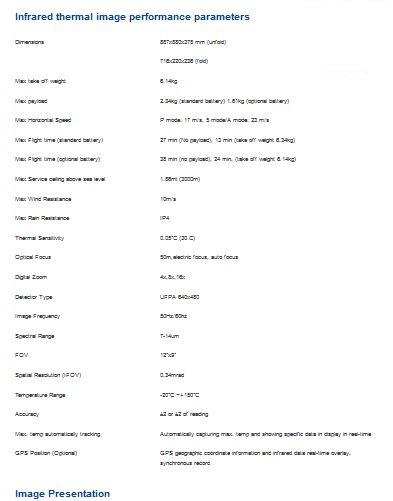 The UAV 640 P has a UFPA 640x480 detector which is a high-quality detector which will deliver clear, crisp thermal images and video to the end-user. It has electric and auto focus up to 50m. The FOV is 12°x9° and spatial resolution (IFOV) of 0.34 mrad. It has a measurement temperature range of -20°C ~+150°C with an accuracy of ±2 or ±2 of reading.