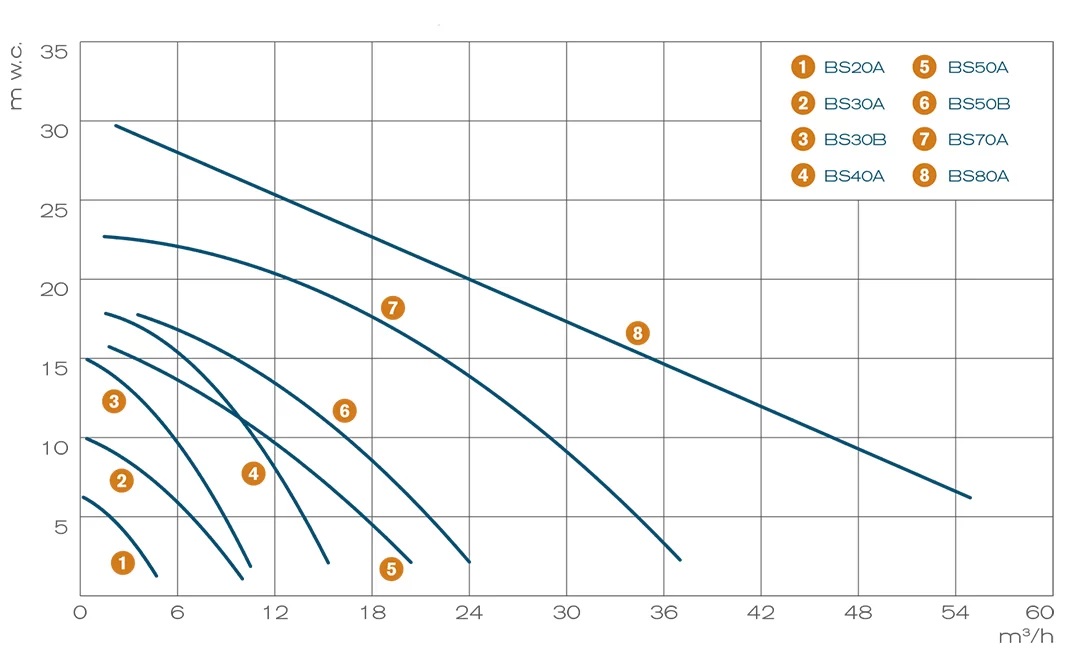 - Maximum head: 30 m w.c.