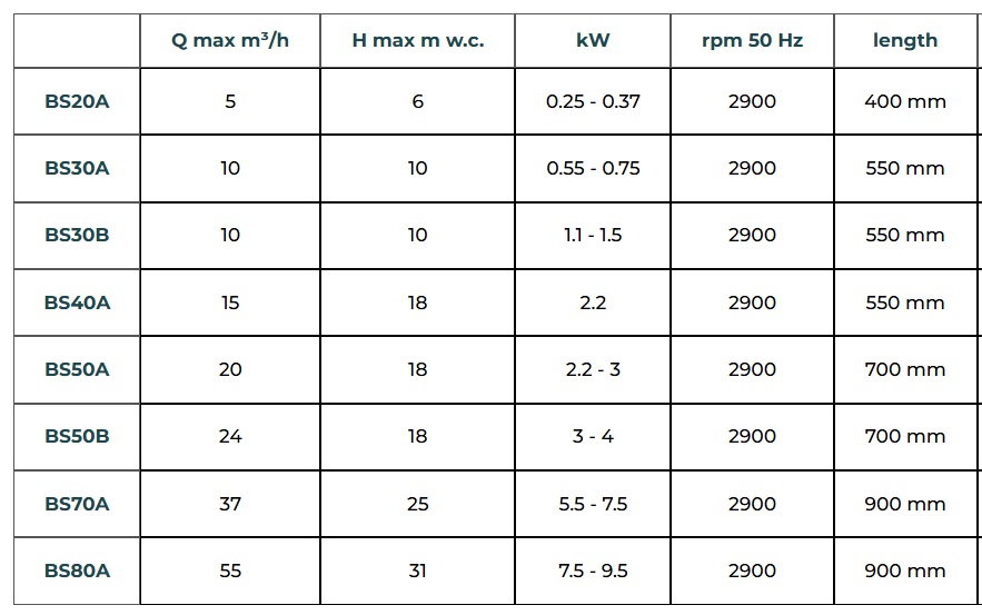 BS pumps are cantilever pumps characterised by the absence of sliding parts (bushings or intermediate bearings); a completely cantilevered pump-shaft coupled directly to the motor makes these pumps perfect for liquids containing particles or abrasive sludge, with a very high risk of becoming worn. BS pumps are suitable for tanks in which the level of liquid is constant. They can be equipped with an extra suction pipe to extend the immersion length.