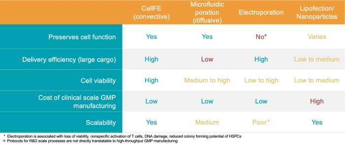 CellFE’s technology enables the cGMP manufacturing of cell therapies in a fundamentally different way to substantially increase product yield and quality. Manipulation of cells in our device results in no observable stress on sensitive cell types, improving quality and reducing regulatory risk. In contrast, electroporation often suffers from loss of cell function which may limit the efficacy of therapies.