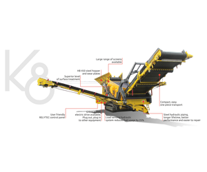 The most versatile scalper on the market with the biggest screen area. The K8e has a large range of screen boxes and screening media available and can be equipped with a Bivitec flip flow screen box. The K8e is designed for heavy duty scalping in quarry applications to ultra-fine screening depending on its set-up and installed screen box and screen media. The hybrid diesel-electric drive includes full electric, plug-in, processing and it has a plug-out function to drive other equipment.Most popular related searches