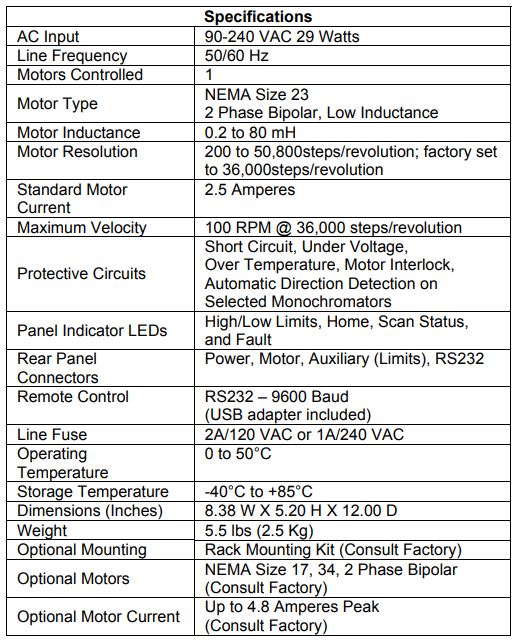 When ordered with a system, the Model 789A-4 comes complete with stepper motor to fit McPherson monochromators or sampling accessories. The cables for limit switches, motor, RS232 communications (with a USB adapter), and power input are included.