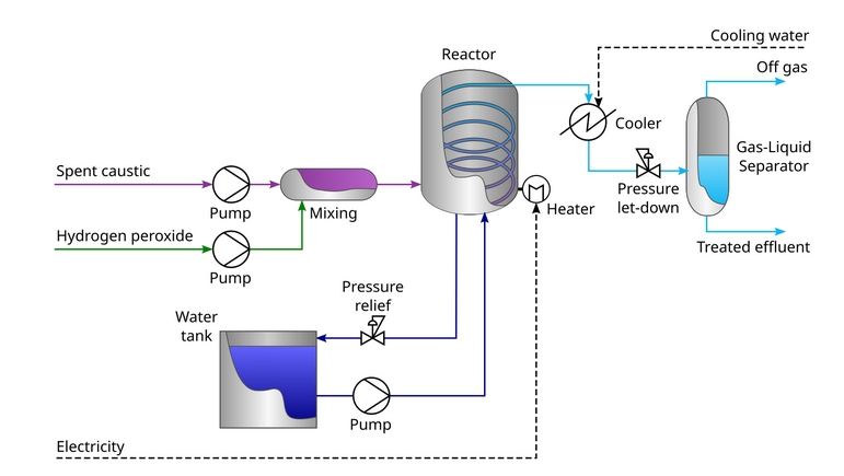 The treated effluent from the AquaCritox® SCH will see >99% of the spent caustic feed COD destroyed. This is thanks to the operation at elevated temperatures, combined with the high oxidising potential of H2O2 (1.44 times higher than Oxygen).