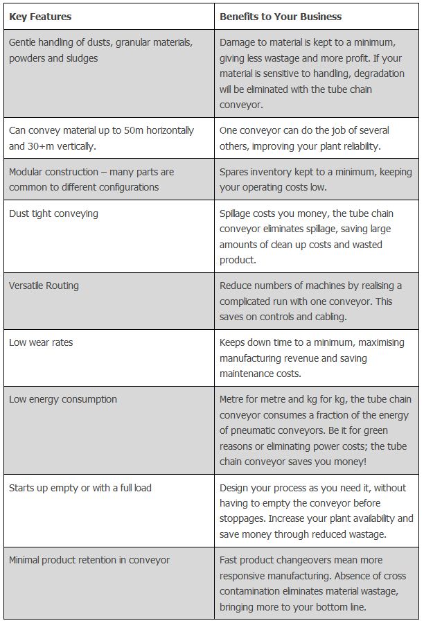 The Schrage Rohrkettensystem GmbH Tube Chain Conveyor has many features that can help your bulk handling plant run more efficiently and cost effectively.