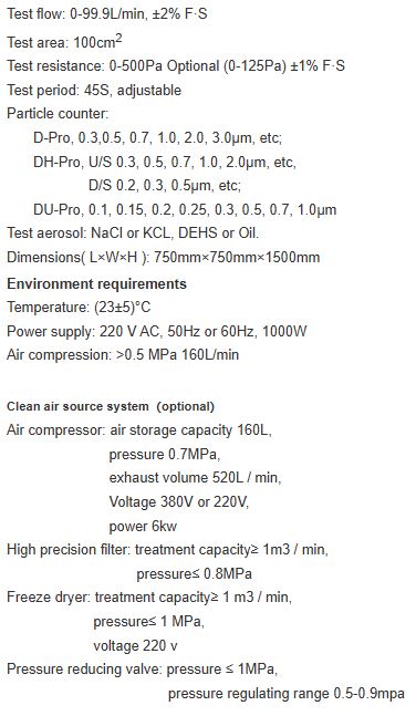 Features: Particle counters as detectors. Remote trouble shooting and calibration are realised. Highly automated. No need to manually adjust the test concentration. switch the test aerosol. Strong data storage and processing capability.