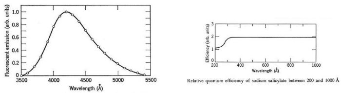 Sodium salicylate is the most popular scintillator we use today. Sodium salicylate has excellent fluorescent efficiency, nearly constant response in the 30 to 300nm spectral region, is easy to prepare, and does not affect vacuum pressure. Stability of fluorescence efficiency is excellent over time in vacuum systems with clean dry vacuum pumps. We have systems in the field using it for more than twenty years with continued good operation. It is our first choice for preparing photomultipliers for spectroscopy in the vacuum ultraviolet.