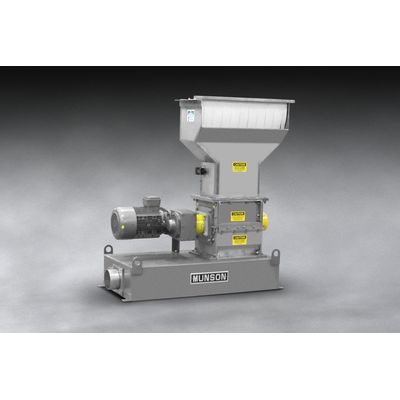 This Munson Model SCC-15-SS Screen Classifying Cutter with a double-width infeed hopper accommodates conveyor-feeding of irregular shapes and sizes of hard, soft and/or fibrous materials by gravity.