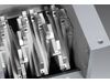 The 30 in. (76 cm) wide hopper funnels materials into a 15 in. (38 cm) wide throat positioned over a solid-mass rotor containing staggered parallelograms, each of which holds two, half-inch (12.7 mm) wide cutter tips that are easy to replace using one machine screw.