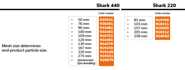 In order to ensure and adjust the end product particle size of the shredded material a suitable screen is needed. Tana offers screens for Shark 440 and 220 models respectively in the following mesh sizes: