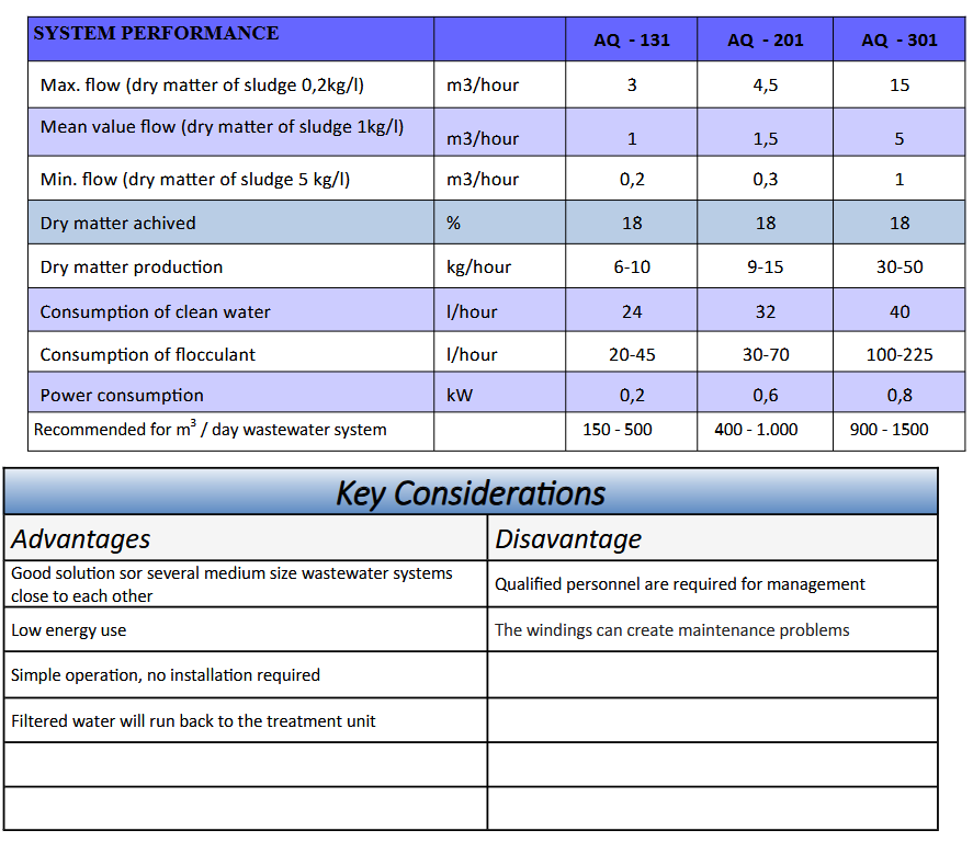 Sludge dewatering treatment with Sludge Screw Press effectively generates dewatered cake with high dry solids content. The dewatering machine mounted on a trailer can treat sludge from a number of medium size wastewater systems. This will significantly increase the effective use and thereby reduce cost associated with sludge disposal.