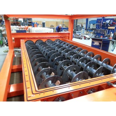 System for handling of cuttings/wet mud. Screwbottom covering 10m2 to avoid the product from bridgebuilding. Complete system designed to recive mud from handling ships and transport the mud to containers for truck transport to a recycling plant.