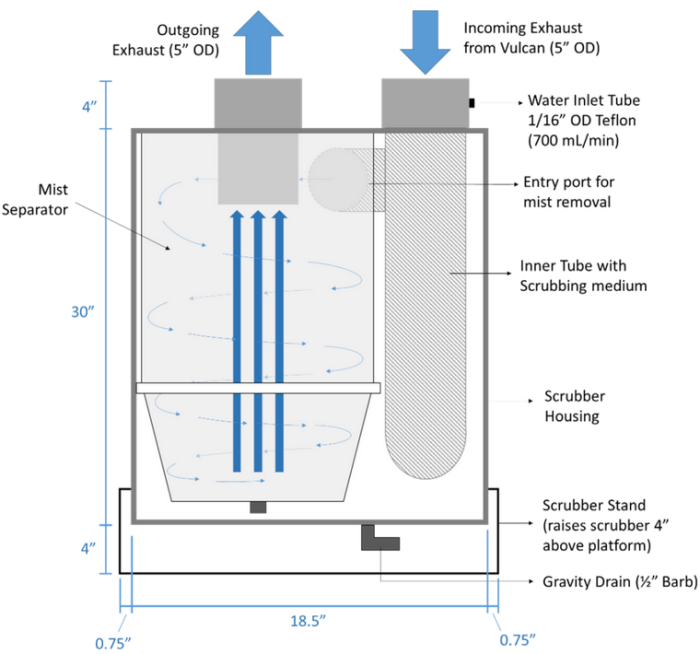 More than 90% efficiency for most exhaust constituents. Low scrubber reagent consumption of 1 liter per minute. Up to 98% of Cyclonic mist retention. Works best with exhaust flow across from 1,000 to 1,400 ft/min across. Compact and innovative design with dimensions of 20 x 20 x 30 in (W x D x H), 50 lbs. Works with minimum of 30 PSI scrubber reagent inlet pressure.