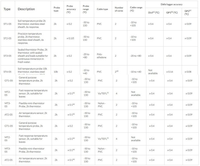 a: Additional (worst case) error due to DL6 Data Logger at -10 to +50 °C. b: Additional (typical) error due to GP1 Data Logger at 0 to +60 °C. c: Additional (worst case) error due to GP2 Data Logger at -20 to +60 °C. d: Co-axial single-core with screen acting as signal loop. e: Over 0-70 °C. f: Teflon lead, vinyl tip.
