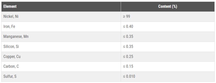 These properties and its chemical composition make Nickel 200 fabricatable and highly resistant to corrosive environments. Nickel 200 is useful in any environment below 600ยบ F. It is highly resistant to corrosion by neutral and alkaline salt solutions. Nickel alloy 200 also has low corrosion rates in neutral and distilled water. This nickel alloy can be hot formed to any shape and formed cold by all methods.