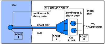 Continuous chlorine dosing is done near to the pump house ahead of bar racks and traveling water screen. 1-2 ppm is recommended so that the complete bar racks and traveling water screen can be kept clean and free from any bio fouling. This will also ensure the pump sump and pump suction side free from any slime growth. The free residual chlorine and the condenser outlet can be measured to determine the chlorine dosing as the chlorine demand of sea water varies according to the season and also the quality of the sea water.