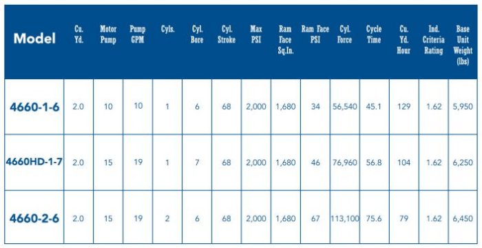This is our most popular, long proven, 2 cubic yard compactor, used for compacting general garbage and recyclable materials. Cylinder forces are offered with 56,550, 76,960, or 113,100 lbs. of force, and the decision to upgrade to a more powerful force rating will depend upon the performance and resulting cost savings expectation, breakdown of waste or recyclable material, and volume being loaded into the machine per hour. With 22” of ram penetration, the model 4660 allows for cleaner container separation.