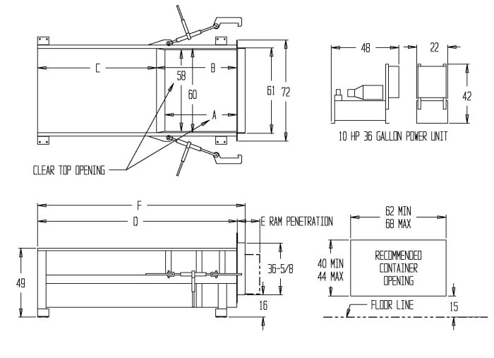 The Model 5260 Stationary Compactor is one of the industrial models, designed for tough waste streams such as small donation centers and thrift stores, recycling centers, and retail applications. Ideal for compacting items with spring back or memory such as corrugated cardboard. This size model is often set up with a security chute for loading from inside the building (ideal for retail settings). Heavy duty industrial ram and frame a longer life expectancy. Available with single 6” cylinder, single 7” cylinder, and twin 6” cylinders.