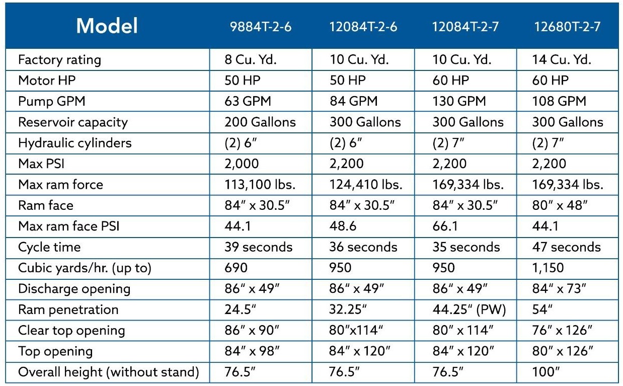 This mini Transfer Station Compactor is designed to pack into semi-trailers for maximum loads and reduced transportation. The Sebright Model 9884T has a 50 HP motor and twin 6” cylinders for resulting maximum force of 113,100 lbs. engineered with extreme use in mind for reduced downtime, lower maintenance, lower operating costs, saving you time and money.