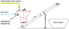 Maintained flow velocities prevent any suspended organic matter from settling with the mineral. Furthermore, wash water enters from the screw classifier into the bottom of the hopper and, aided by the central stirrer, the grit and sand particles abrade against each other scouring any attached organic matter from their surface. This scouring process is further enhanced by air agitation. Eventually, the grit is conveyed by the screw classifier, washed, dewatered and discharged into a container. Removal of organic matter > 97 % is attainable.