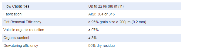 Effluent contaminated with grit and organic matter discharges into the top of the hopper close to the periphery where a coerced, slow rotational movement is produced and aided by the central stirrer. This rotational movement together with sufficient retention for variations of particle settling velocities induce the grit and sand to spiral and settle by gravity to attain > 95 % removal of 0.20 – 0.25 mm (200 μm – 250 μm) size grit particles.