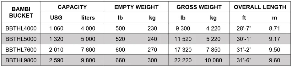 The Bambi Torrentula Bucket was first introduced in 1997 as an alternative to the single-dump udder valve on the original Bambi Bucket. The Bambi Torrentula Bucket offers 4 different sizes ranging from 4000 L (1060 USG) to 9800 L (2590 USG). The Bambi Torrentula Bucket is available with a 4-pump PowerFill, internal configuration. This bottom-filling technology provides fill rates of 1,700 US gallons per minute. Kits are available to add the PowerFill Torrentula system to your Bambi Torrentula Bucket.