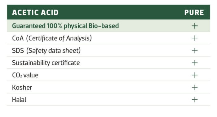 We are proud to be able to offer our finest sustainability labelled Acetic Acid Pure which gives you a fully certified product guaranteed to be 100% physical bio-based.